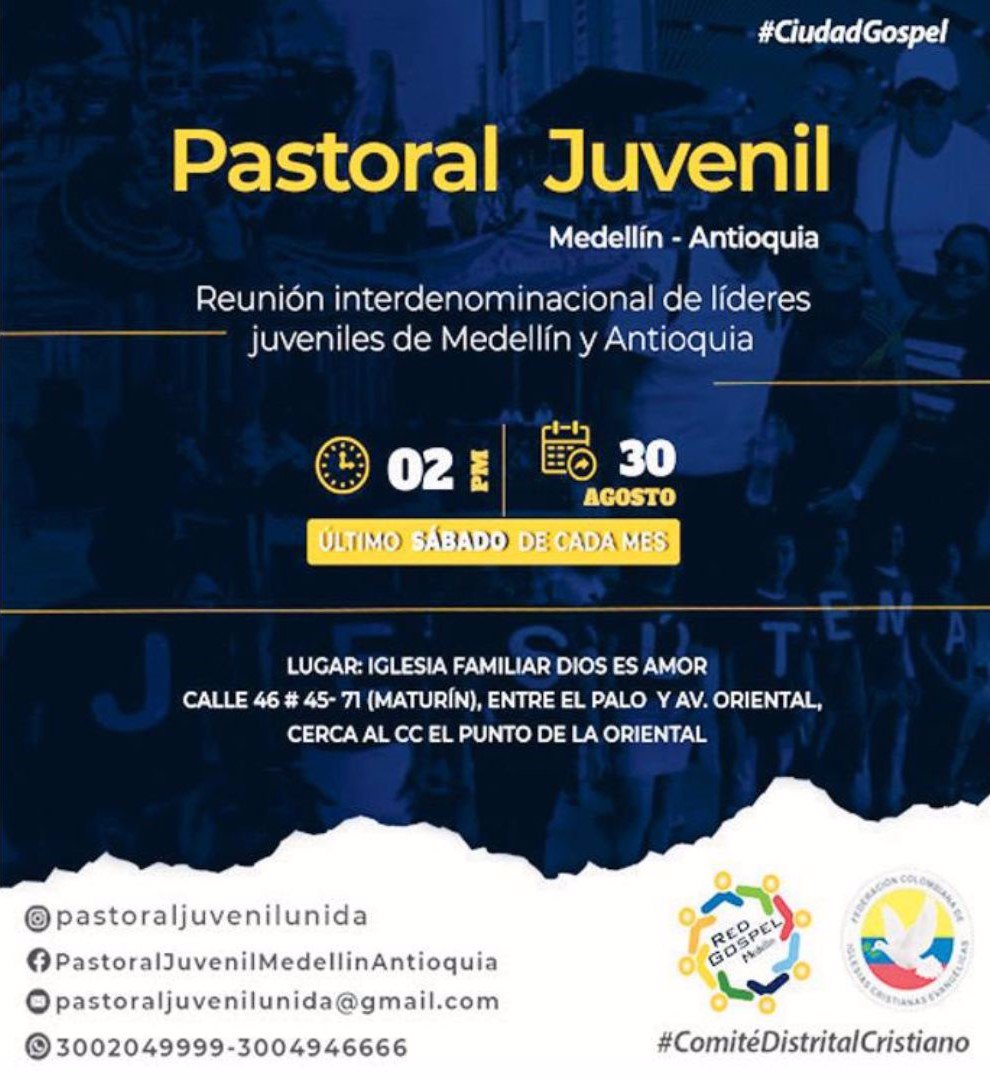 Reunión Interdenominacional de Líderes y Pastores Juveniles de Medellín y Antioquia, último sábado de cada mes, 2:00 p. m.