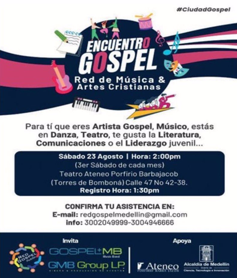 Medellín en materia de Música Góspel, avanza reuniendo los músicos, grupos de alabanza y demás ministerios cristianos (música, danza, teatro, literatura, comunicaciones, deporte y liderazgo juvenil), en su Encuentro Góspel cada mes en la ciudad, con el apoyo de la Alcaldía Distrital de Medellín y a través de La Red de Música & Artes Cristianas, visión que Dios le ha dado a Diego Alejandro director del grupo Góspel Music Band, de GMB Group LP (Diseño & Producción de Eventos) y de la Red Góspel de Medellín, apoyado también por los salmistas Miranda Negra y Luís Campos de Bogotá, encuentro a través del cual se busca fomentar la unidad de los diferentes ministerios cristianos, aportar experiencias y capacitaciones a los músicos y artistas cristianos, para impactar el Distrito y los demás municipios del departamento con música cristiana y eventos evangelísticos a través de grandes eventos de ciudad. Tels: 30020049999 – 3004946666.
