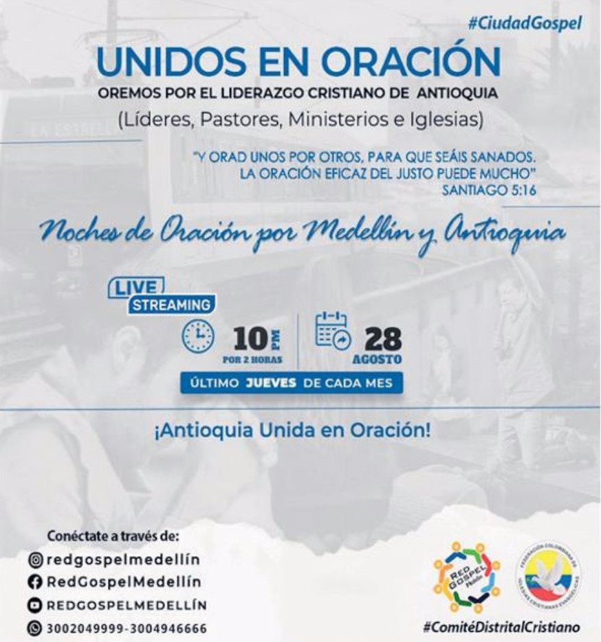 Colombia es bendecida en oración por la Iglesia Cristiana de Medellín, en sus noches de clamor por el liderazgo cristiano de Antioquia y por las familias de nuestro hermoso país Colombia, tiempo especial de oración que se ha fomentado como cultura en el departamento antioqueño, el último jueves de cada mes (virtual), de 10:00pm a 12:00am, dos horas de oración y clamor por el liderazgo cristiano y por el país. #RedGospelMedellín Tels: 30020049999 – 3004946666.
