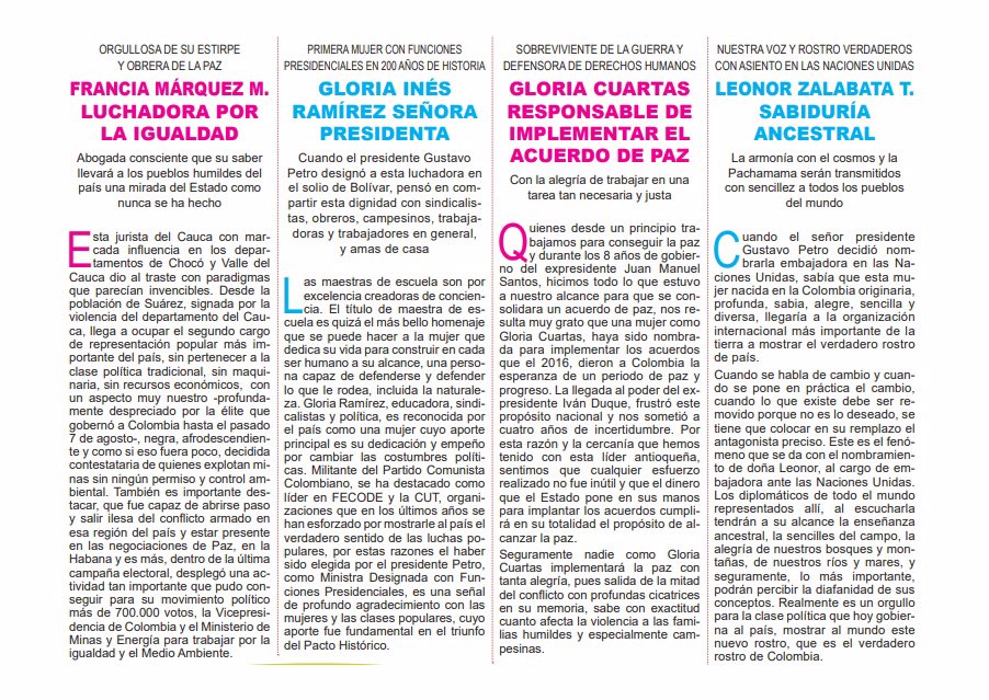 Francia Márquez, Gloria Inés Ramírez, Gloria Cuartas y Leonor Zalabata son, sin lugar a duda, las más dignas y fieles representantes de la Colombia sencilla, estudiosa, enjundiosa, valiente y bella en todos los aspectos, y precisamente es la Colombia desconocida por el mundo entero, pues el rostro que la comunidad internacional conoce no corresponde en nada a la forma de ser de nuestro pueblo y la esencia de nuestro país, la semblanza distorsionada que permanece en el imaginario de gran parte de la humanidad, es la que formó el Viejo Orden que terminó el pasado 7 de agosto para mantener el gran negocio de la guerra sin que les importara para nada el sufrimiento causado al noventa y cinco por ciento de la población colombiana.